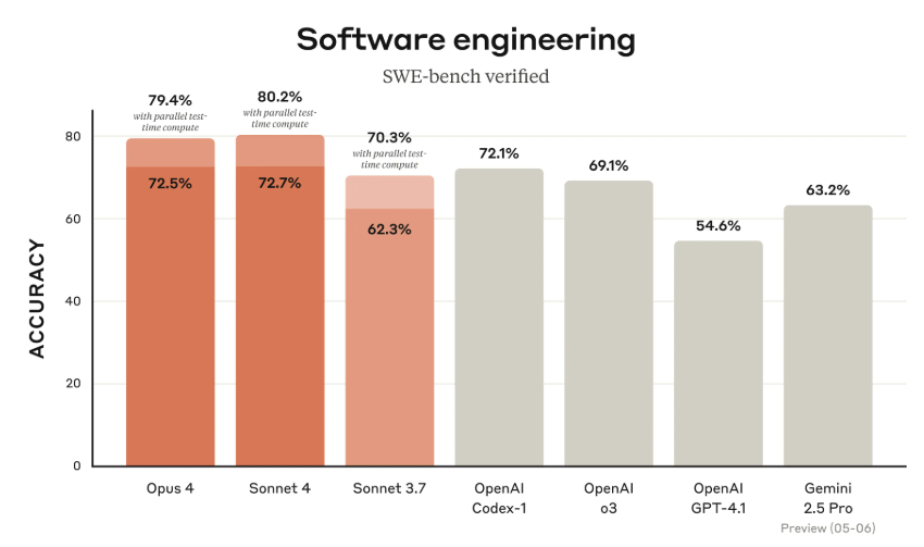 Claude 4 系列在 SWE-bench Verified 测试中展现了卓越性能,该测试专门用于评估模型解决真实软件问题的能力。官方数据显示,Claude Opus 4 和 Claude Sonnet 4 在复杂软件问题处理中达到了行业领先水平,展现出极高的稳定性和准确性。这一成果巩固了 Anthropic 在 AI 编码领域的领先地位,为开发者提供了从简单脚本到大型项目开发的可靠工具。